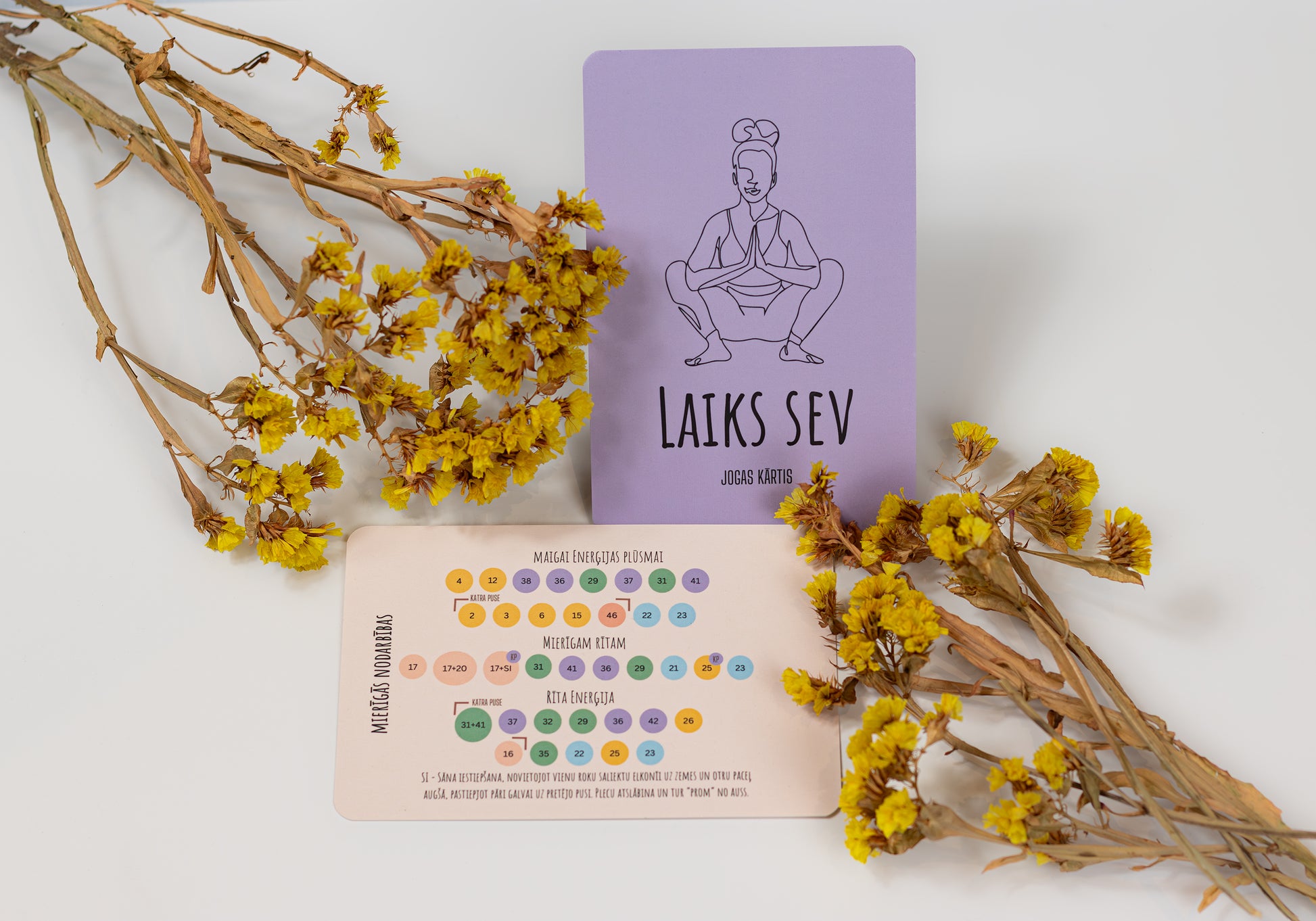 - Fiziska un garīga harmonija vienā rīcībā — jogas kārtis palīdz ķermenim atslābināties, atrast līdzsvaru un piezemēties; afirmāciju kārtis — prātam un dvēselei, attīrot vecos ieradumus un veidojot jaunas pozitīvas domas.