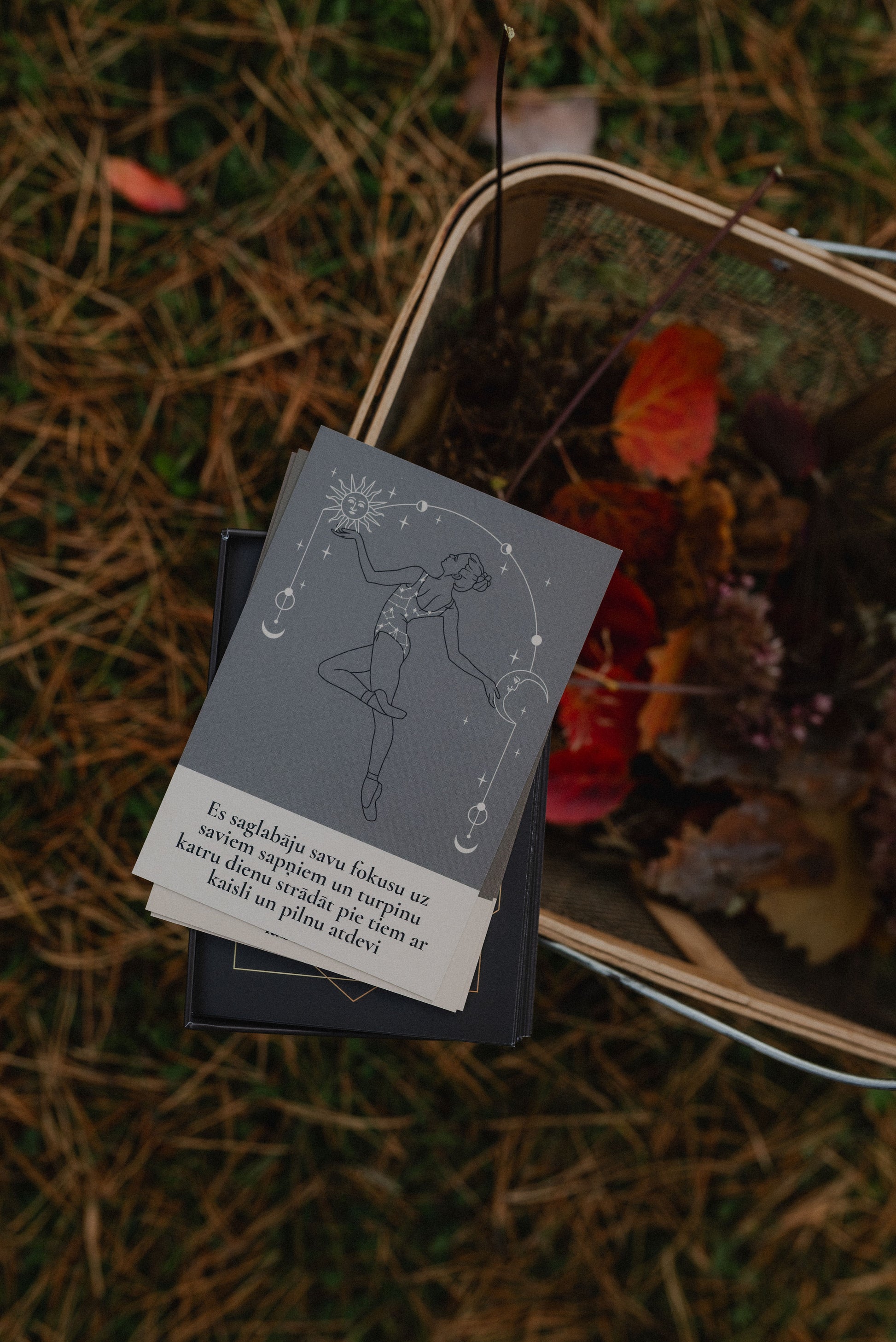 - Izturīgs un estētisks komplekta iepakojums / maisiņš — lai kārtis vienmēr būtu pa rokai, vai tas būtu Tavā jogas vietā, guļamistabā vai somā ceļā uz meditāciju.