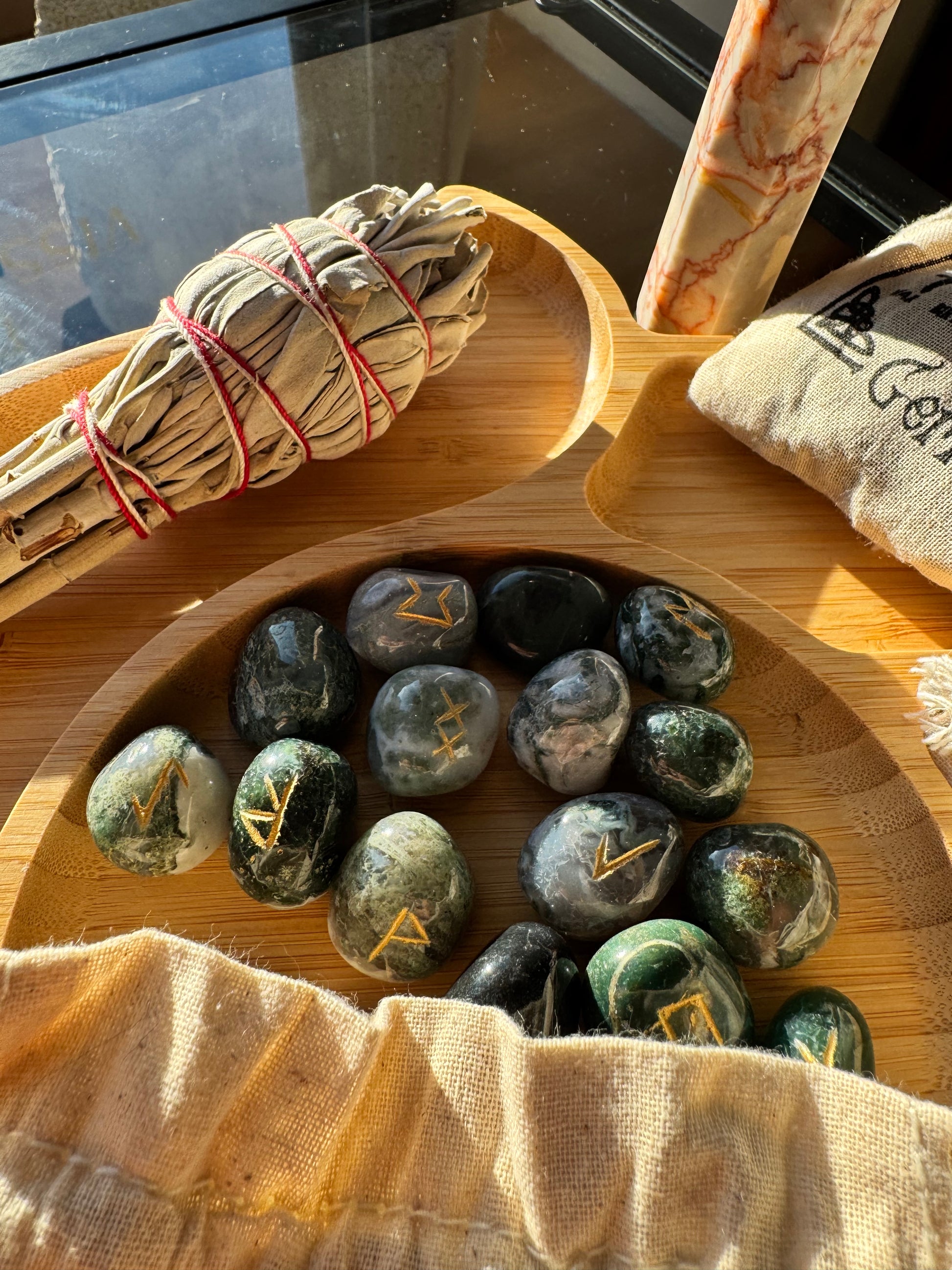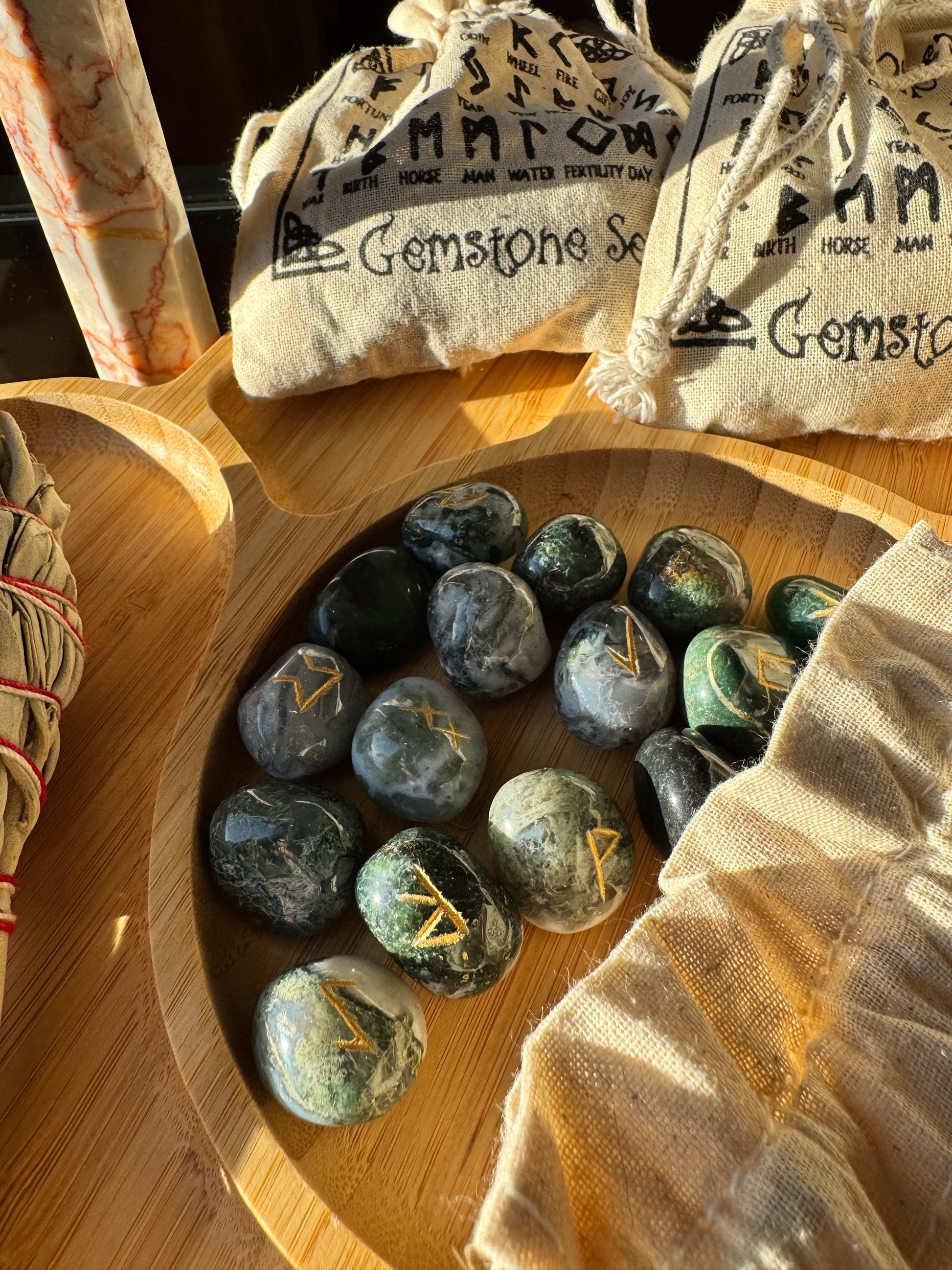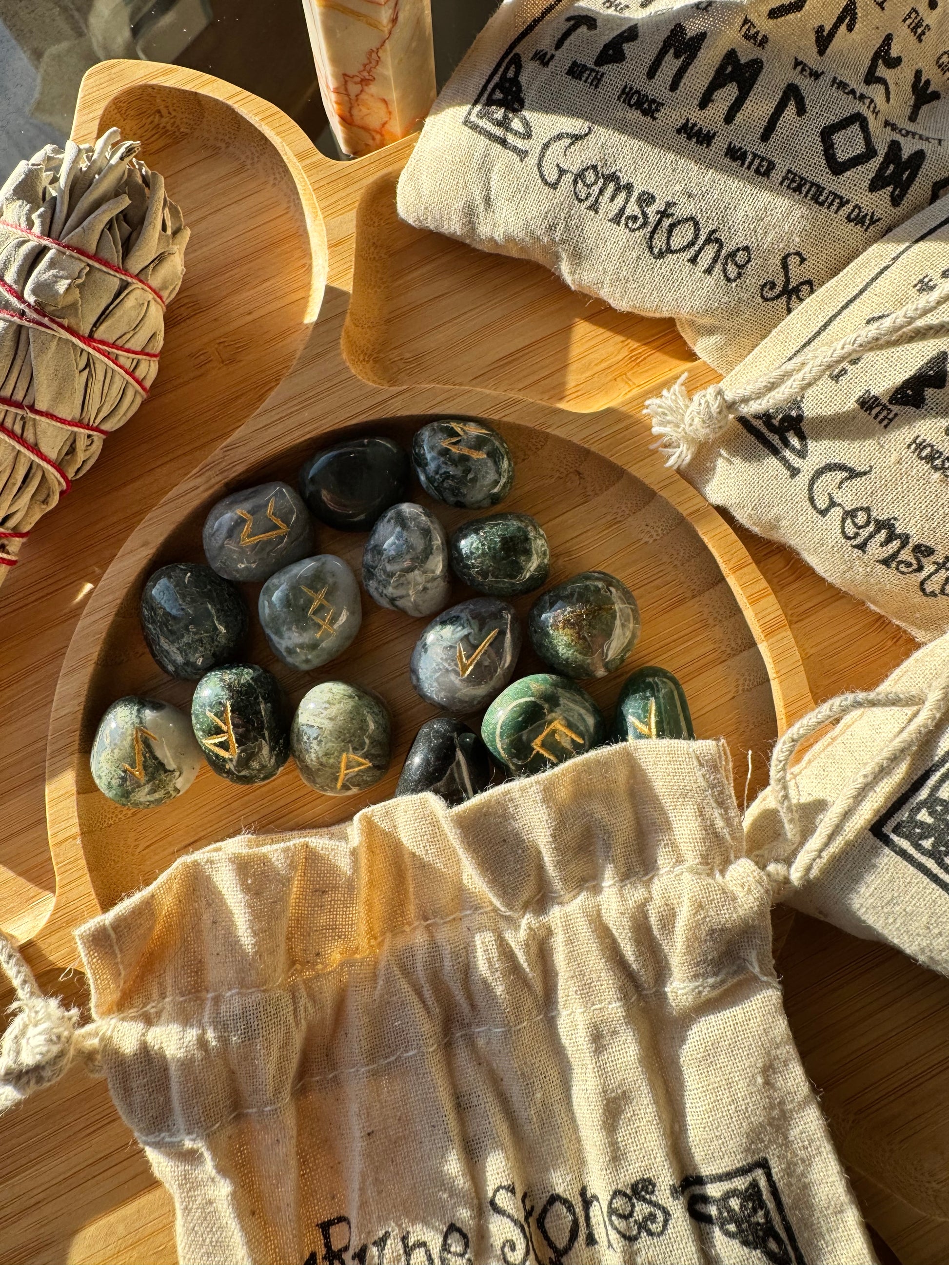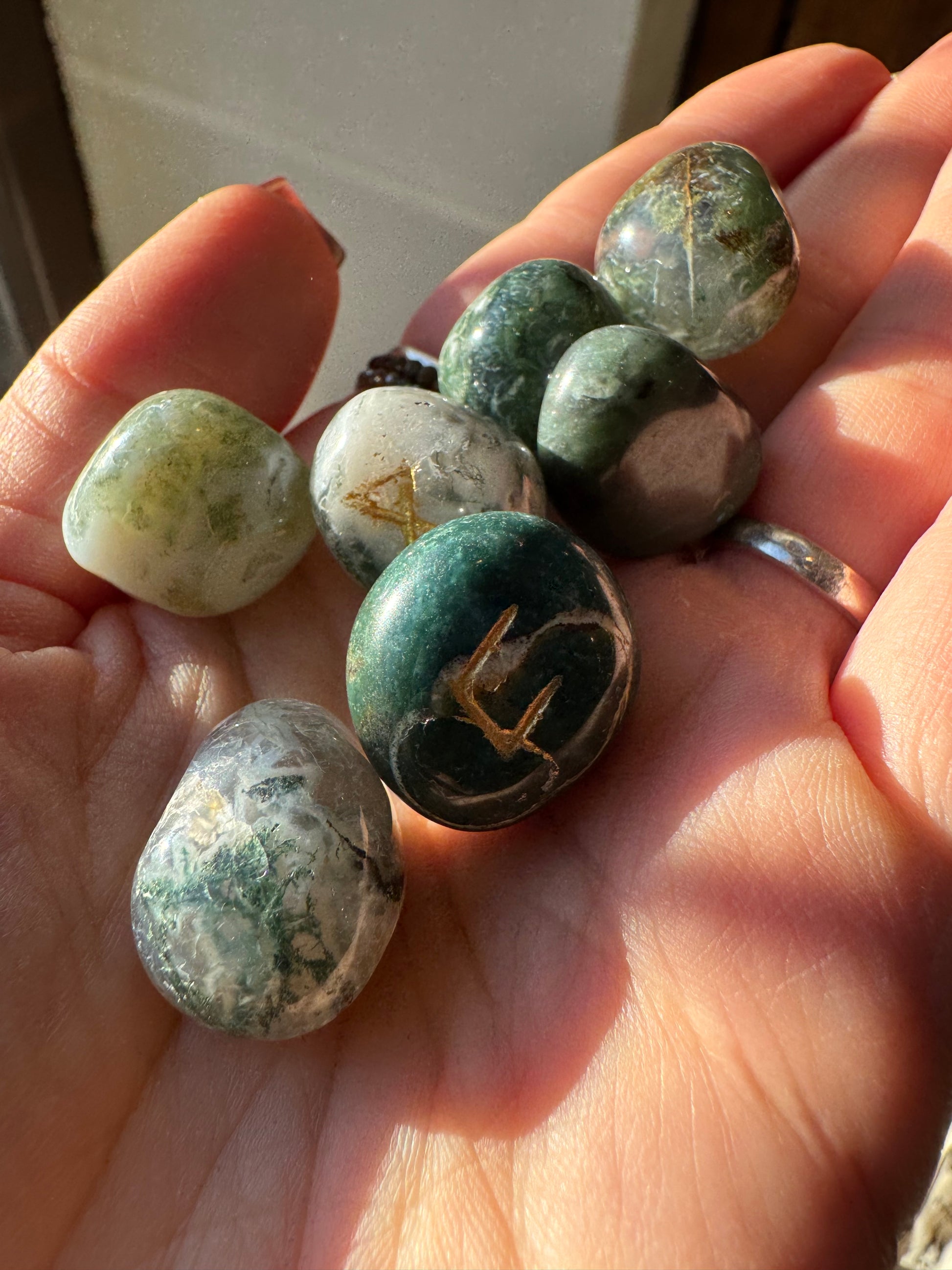 Kad rūnas veidotas no spēcīga kristāla, kā sūnu ahāts, simboli iegūst vēl dziļāku vibrāciju, jo akmens enerģija pastiprina un harmonizē to vēstījumu.