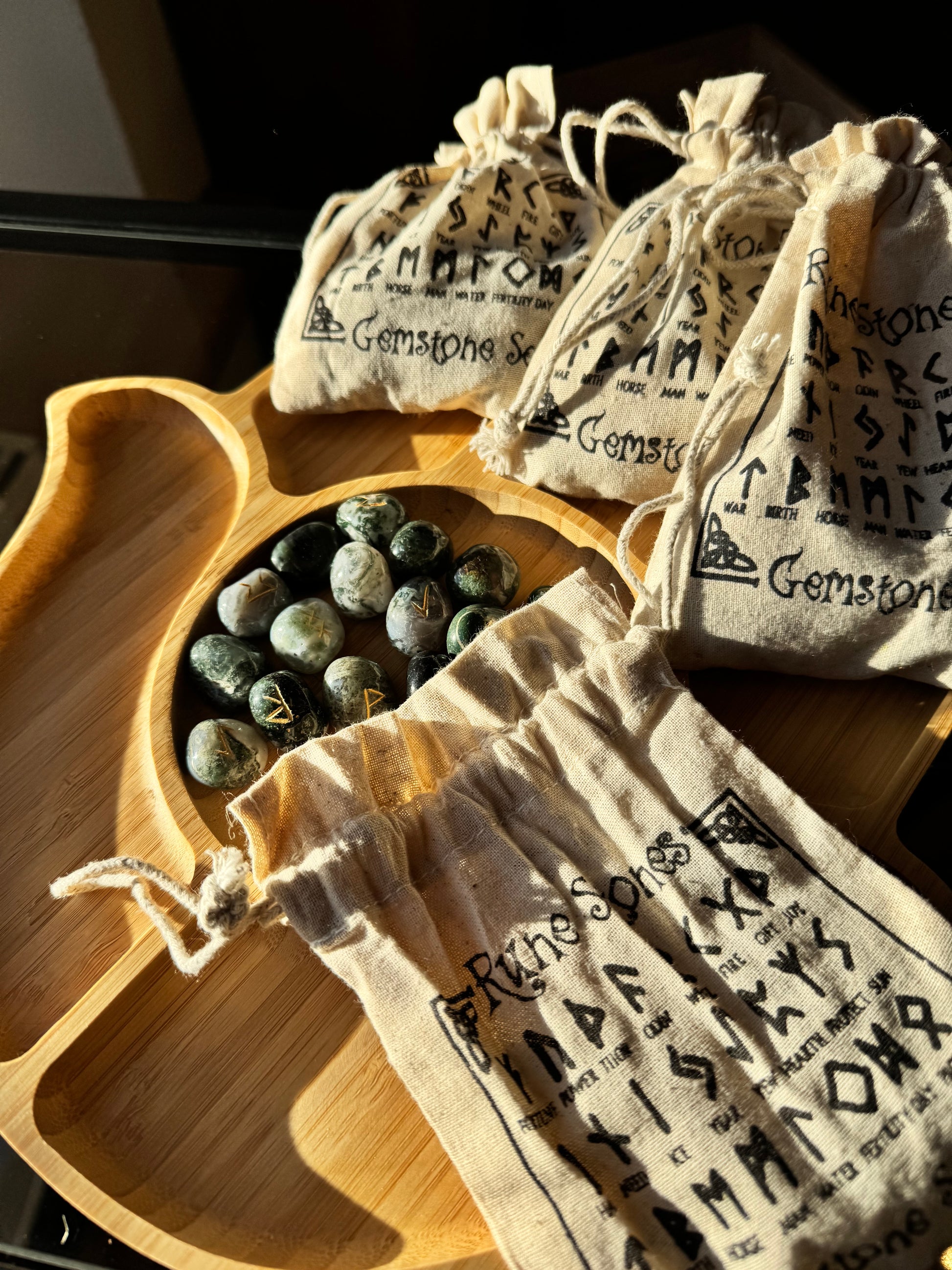 Atklāj rūnu maģijas pasauli ar izsmalcinātu sūnu ahāta rūnu komplektu, kas radīts no augstas kvalitātes dabīgā akmens, iegūta Indijā – reģionā, kur roku darbs un dabīgo kristālu apstrāde tiek nodota no paaudzes paaudzē. Katrs akmens ir rūpīgi slīpēts, un uz tā ar precizitāti iegravēta rūna, saglabājot gan estētiku, gan simbolisko spēku.